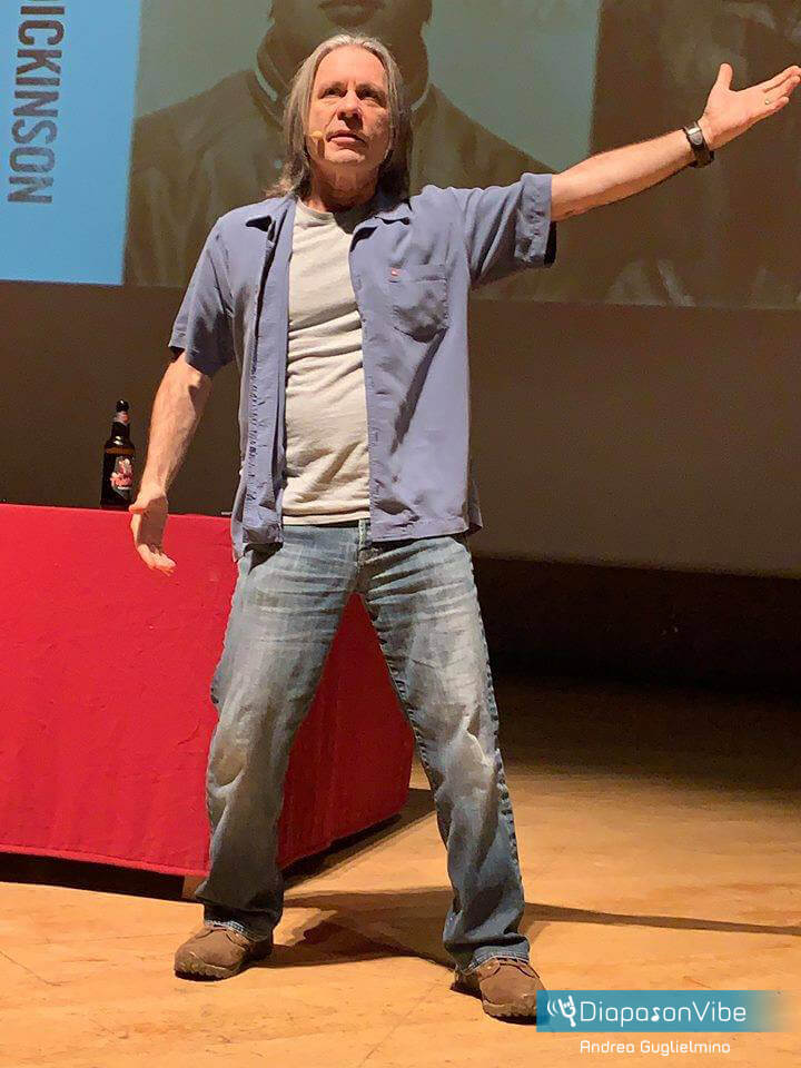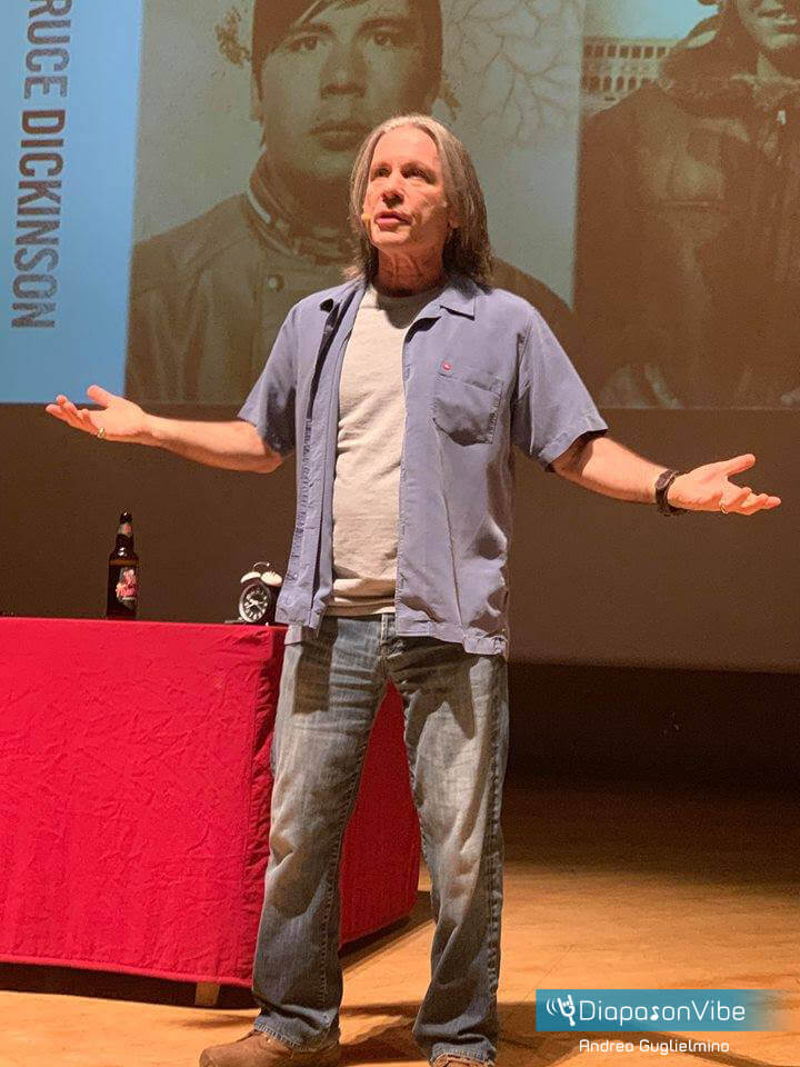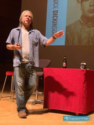In compenso, va detto che Bruce si spende parecchio durante lo spettacolo – e particolare privilegio per noi, che avendo prenotato per tempo ci troviamo in primissima fila con lui a pochi metri di distanza – che occupa lo spazio temporale di quasi tre ore ed è impostato come un vero e proprio ‘one man show’, che agli aneddoti di vita affianca battute di tipico stampo british, piccole imitazioni, riflessioni e quant’altro. Dickinson, che come rivela ha studiato recitazione, regge il palco tutto da solo, senza alcuna moderazione e senza artifici. Usa un proiettore per scorrere le foto e un piccolo laser per puntare le immagini, e poi le commenta in maniera del tutto spontanea, come probabilmente farebbe durante una serata tra amici, davanti a una birra. Letteralmente vero, dato che mentre chiacchiera sorseggia amabilmente una delle sue, la The Trooper, un auto product-placement per ottimizzare la pubblicità.