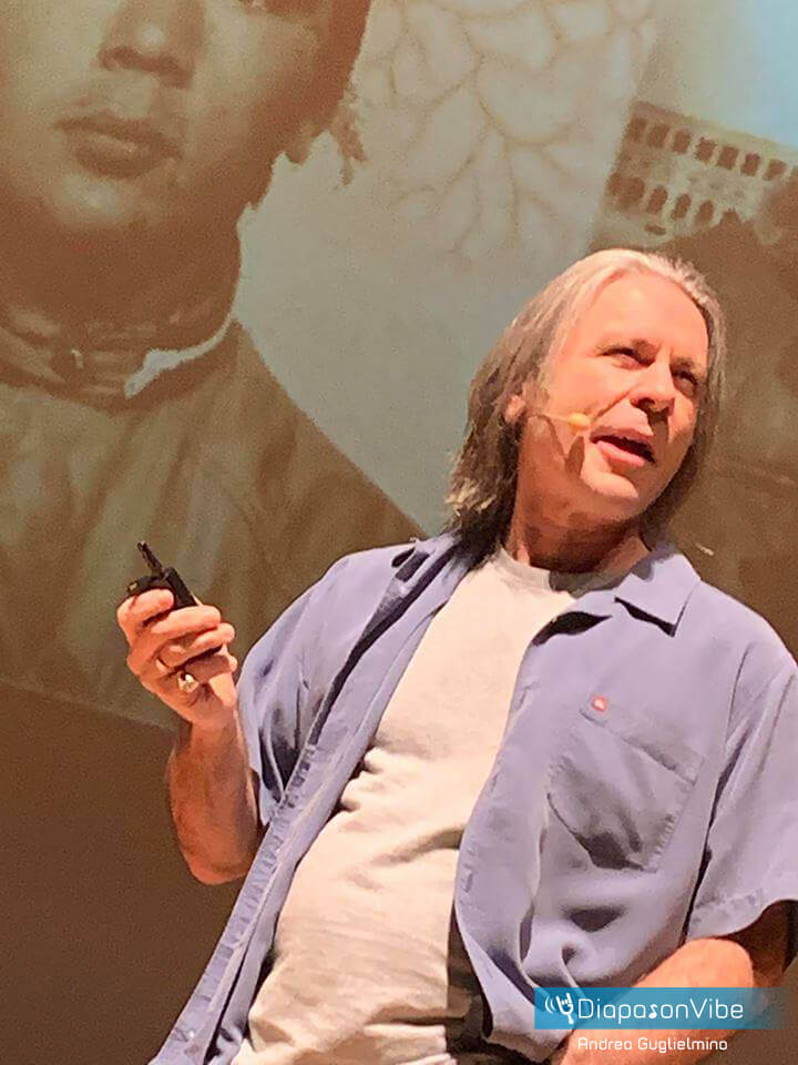 Il suo inglese è chiarissimo e comprensibile, l’atteggiamento cordiale e aperto, la mimica fa il resto e non si disdegna un po’ di improvvisazione. Certo un po’ per godersi il tutto la lingua bisogna masticarla, ma è tutto impostato in maniera talmente spontanea che basta un livello scolastico affiancato alla lettura del libro per capire di cosa si stia parlando. Gli argomenti sono vari, dall’infanzia in puro ambiente contadino alle prime esperienze con una band: