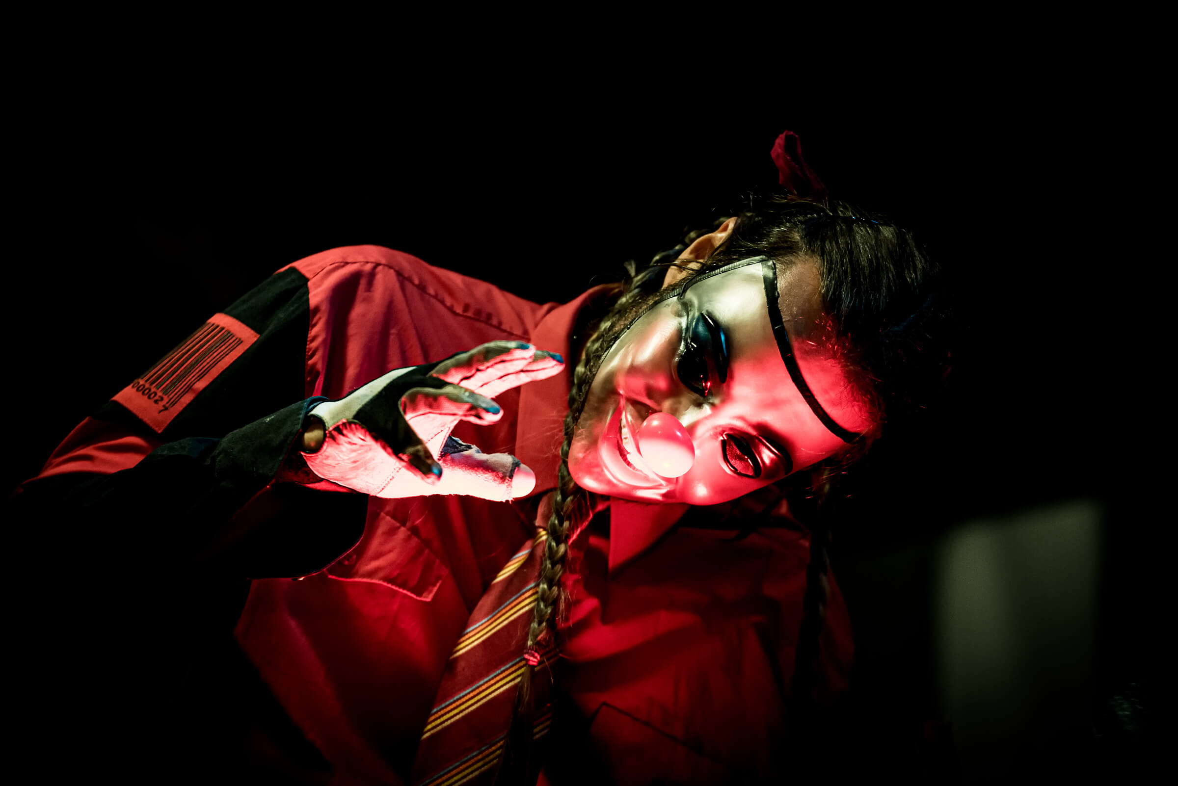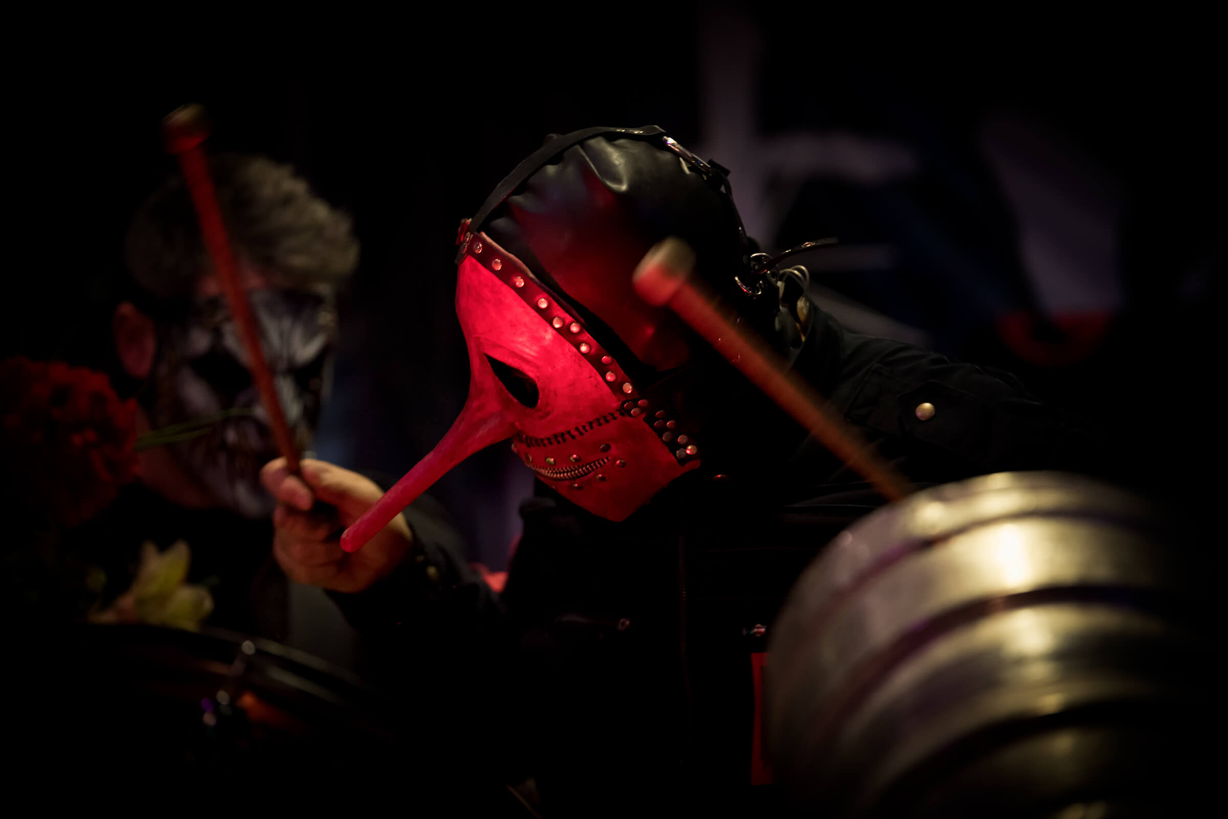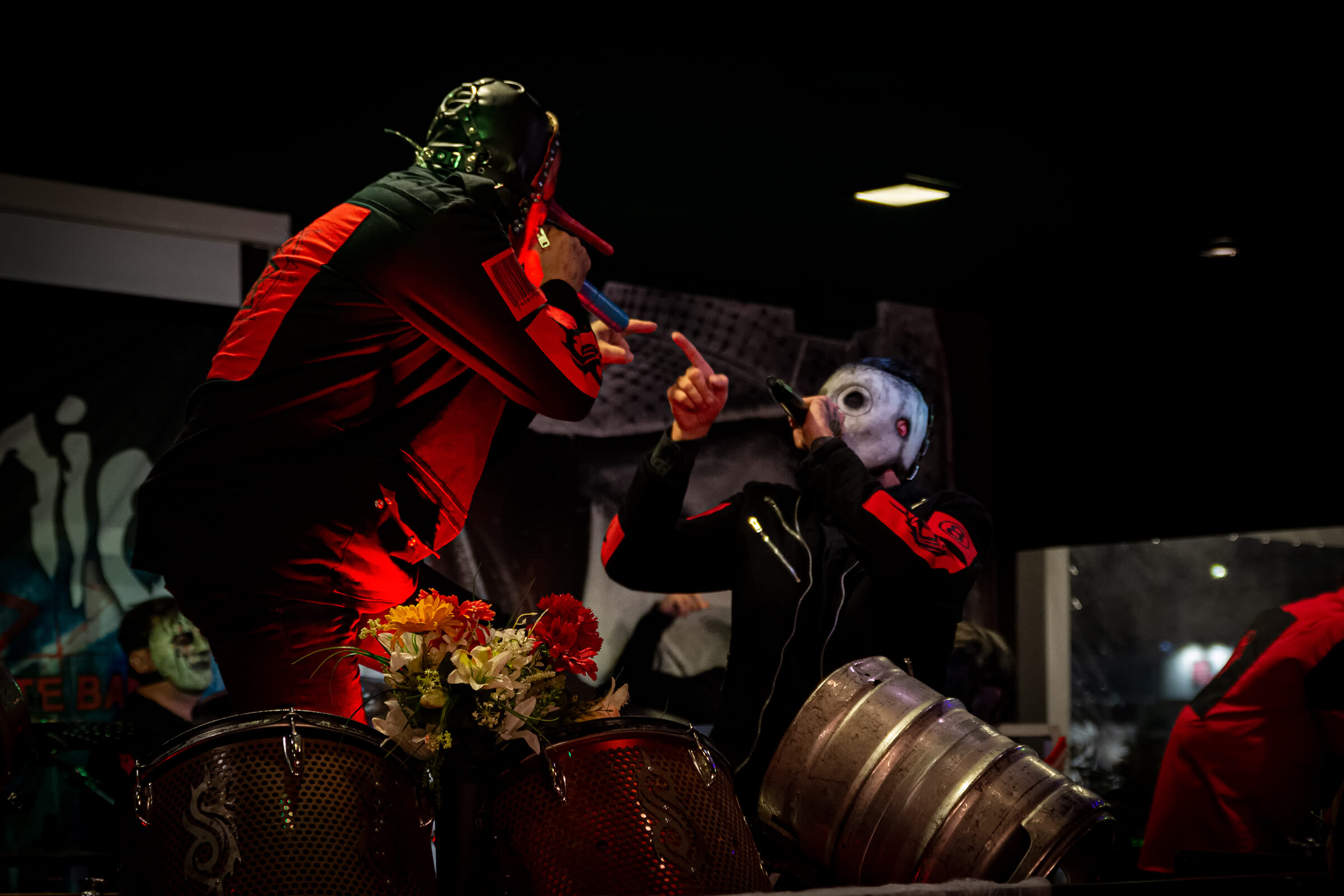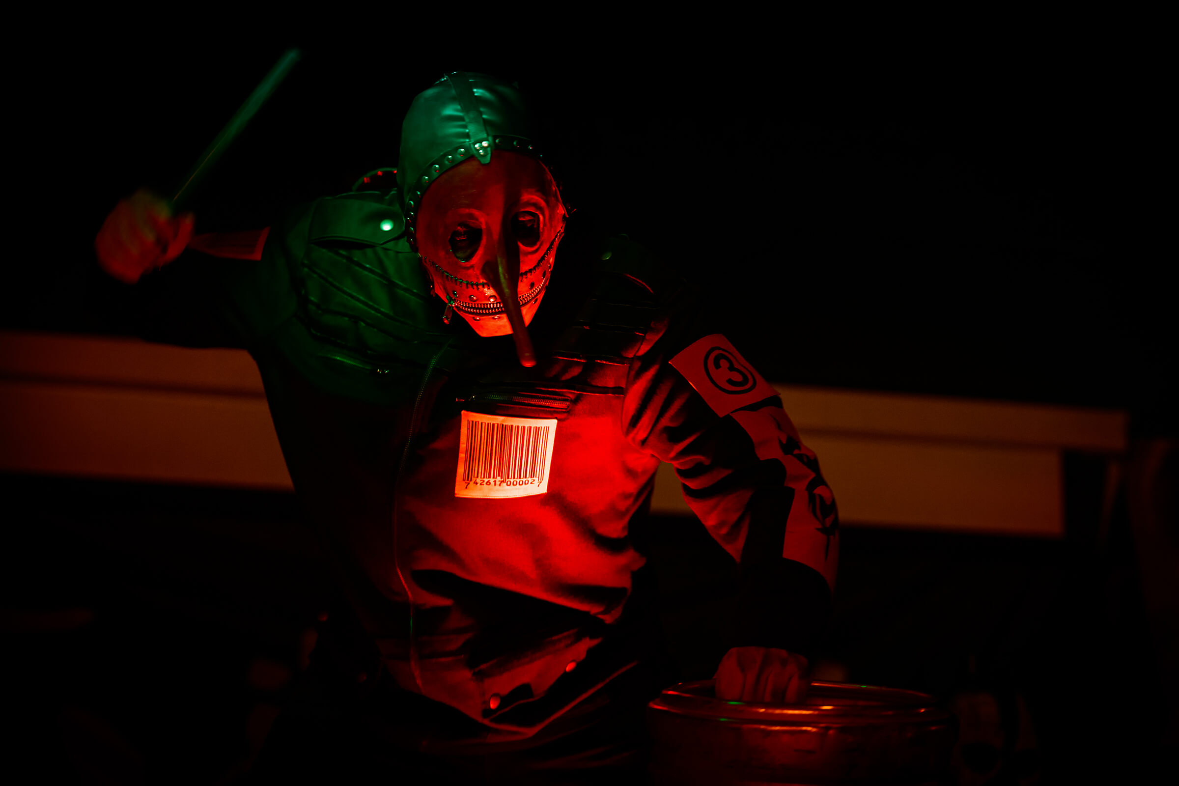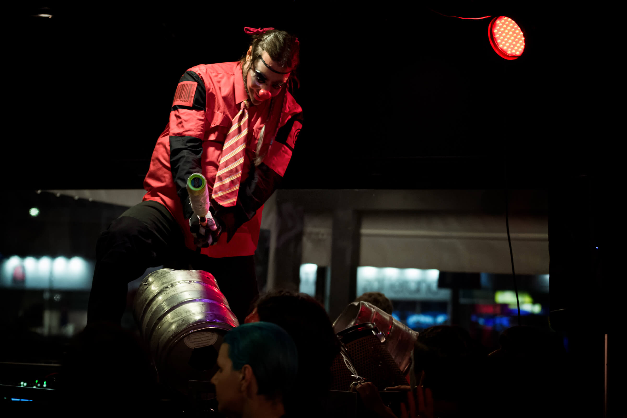Nel frattempo la serata continua e il concerto diventa coinvolgente regalando sempre qualcosa di inaspettato. Iniziano i giochi tra i percussionisti, il pagliaccio e la maschera dal naso lungo tengono il tempo con una mazza e un barile di birra… tirano fuori i tamburi e usano bacchette che si illuminano di rosso e verde che poi regalano.