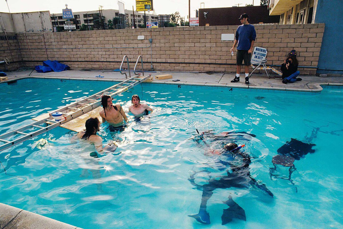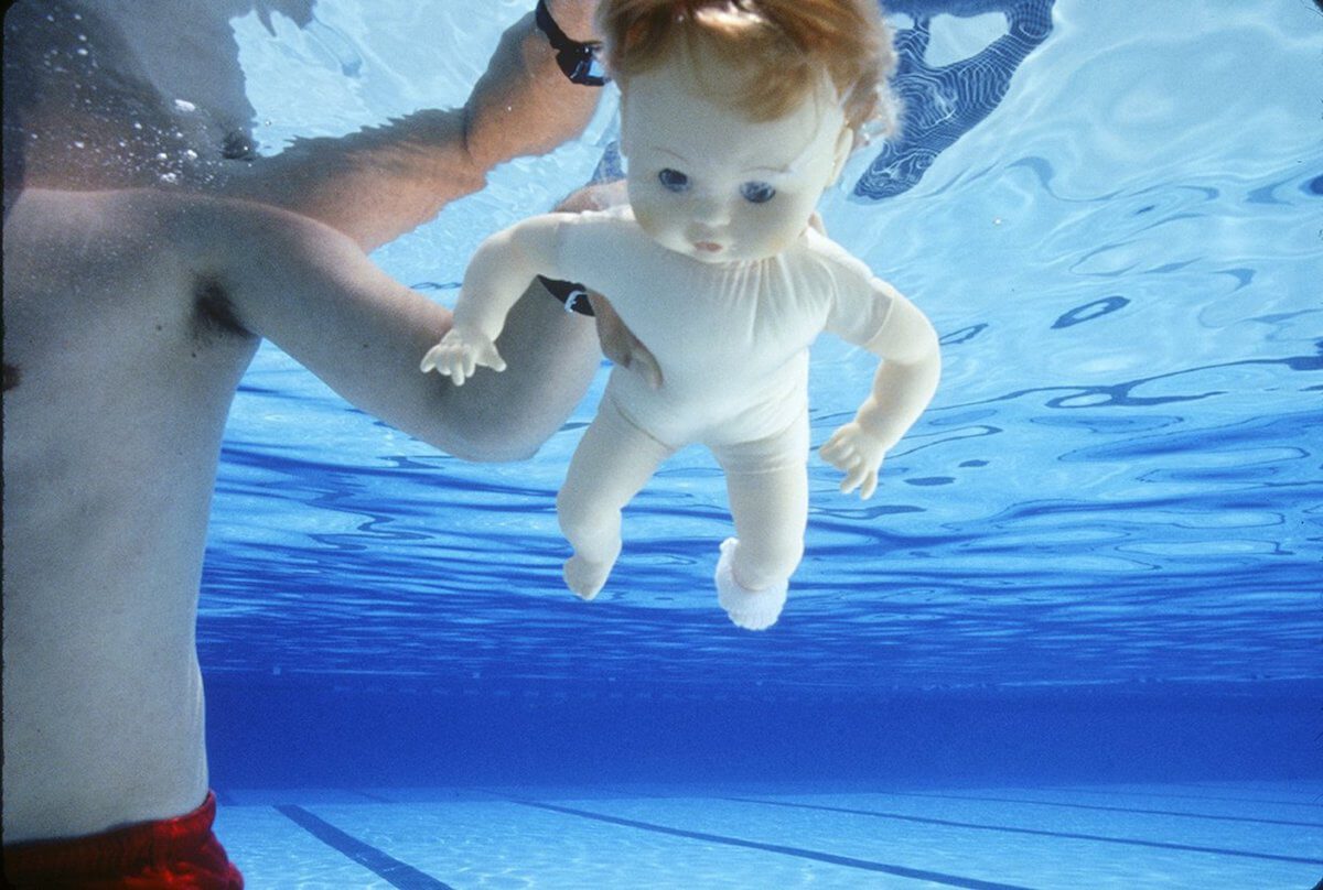 Il set era abbastanza semplice, visto che avrebbero scattato all’interno di una piscina senza nessuna scenografia. Il servizio fu realizzato presso la piscina The Rose Bowl Aquatics Center sempre a Pasadena in massima sicurezza con la supervisione di un bagnino. Poiché parliamo degli anni novanta, il digitale ancora non esisteva. Non avendo quindi la possibilità di controllare a priori il risultato, oltre all’imprevedibilità del comportamento del bambino, il fotografo fece diverse prove d’illuminazione e, con l’ausilio di un bambolotto, simularono i passaggi del piccolo per trovare la giusta inquadratura e la messa a fuoco perfetta.