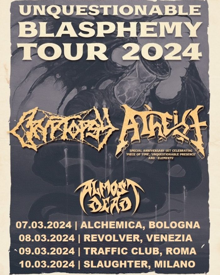 I Cryptopsy e gli Atheist arrivano in Italia per ben quattro tappe del loro nuovo tour europeo, intitolato Unquestionable Blasphemy, accompagnati dal gruppo nordamericano degli Almost Dead.