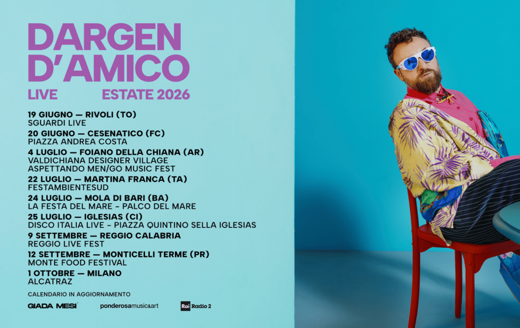 Il tour estivo di Dargen D’Amico prenderà il via il 19 giugno da Rivoli (TO) con un appuntamento al festival Sguardi Live, per poi proseguire il 20 giugno a Cesenatico (FC) nella suggestiva Piazza Andrea Costa. Il 4 luglio sarà la volta di Foiano della Chiana (AR) con l’anteprima del Men/Go Festival, mentre il 22 luglio l’artista salirà sul palco del FestambienteSud a Martina Franca (TA). Il 24 luglio farà tappa a Mola di Bari (BA) sul suggestivo Palco di Mare, mentre il giorno successivo, il 25 luglio, sarà a Iglesias (CI) per il Disco Italia Live. Dopo la pausa estiva, il viaggio musicale riprenderà il 9 settembre a Reggio Calabria nell’ambito del Reggio Live Fest e il 12 settembre a Monticelli Terme (PR) durante il Monte Food Festival. Gran finale il 1° ottobre a Milano, dove Dargen D’Amico si esibirà sul palco dell’iconico Alcatraz.