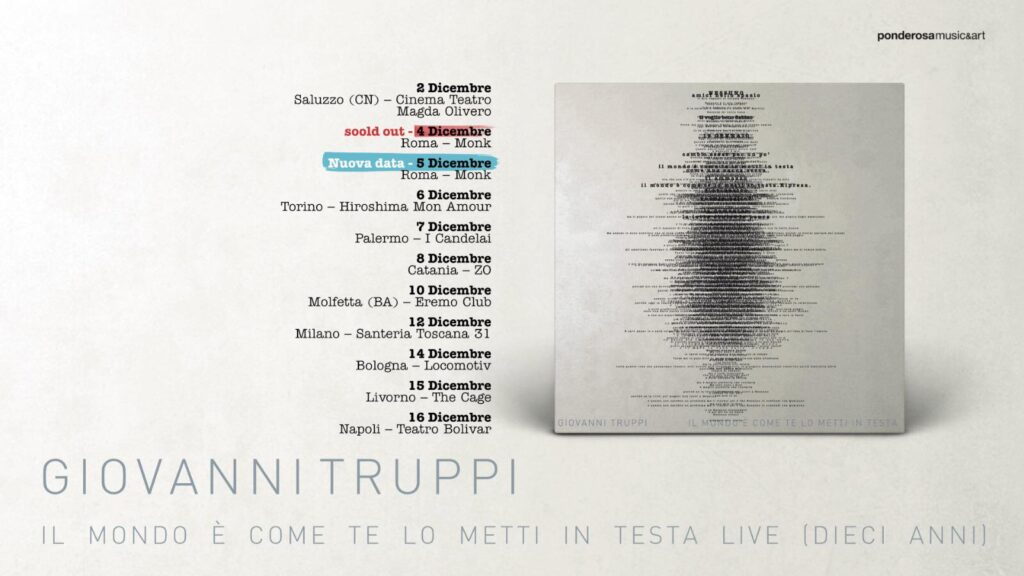 Giovanni Truppi torna in tour per celebrare il decimo anniversario della pubblicazione di Il Mondo è come te lo metti in testa, secondo album in studio ad aver segnato la sua carriera. In occasione dell’anniversario uscirà anche una pubblicazione straordinaria per la prima volta in vinile di Il Mondo è come te lo metti in testa distribuito da Virgin Music LAS/Universal Music Italy a Novembre. Ad accompagnarlo sul palco ci sarà Marco Buccelli, batterista e produttore, con il quale ha co-scritto e registrato interamente dal vivo l’album; un’occasione per rievocare l’esperienza condivisa sui palchi di tutta Italia nel 2013.