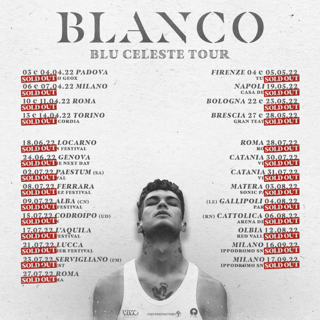 A distanza di pochissime ore dalla messa in vendita, sono stati polverizzati ancora una volta i biglietti delle nuove date estive del primo tour di Blanco, che vanno ad aggiungersi a quelle nei club, anch’esse già tutte sold out dal giorno di annuncio. Prodotto e distribuito da Vivo Concerti e Friends & Partners, il Blu Celeste Tour ha già totalizzato oltre 300mila venduti, rendendo ormai Blanco un fenomeno inarrestabile.